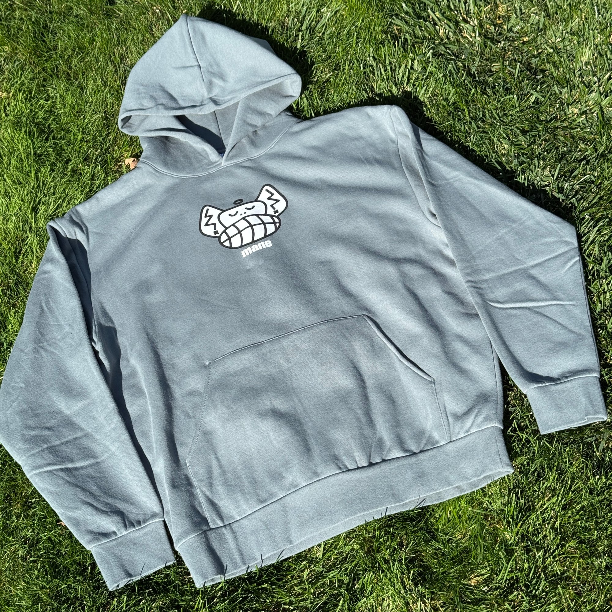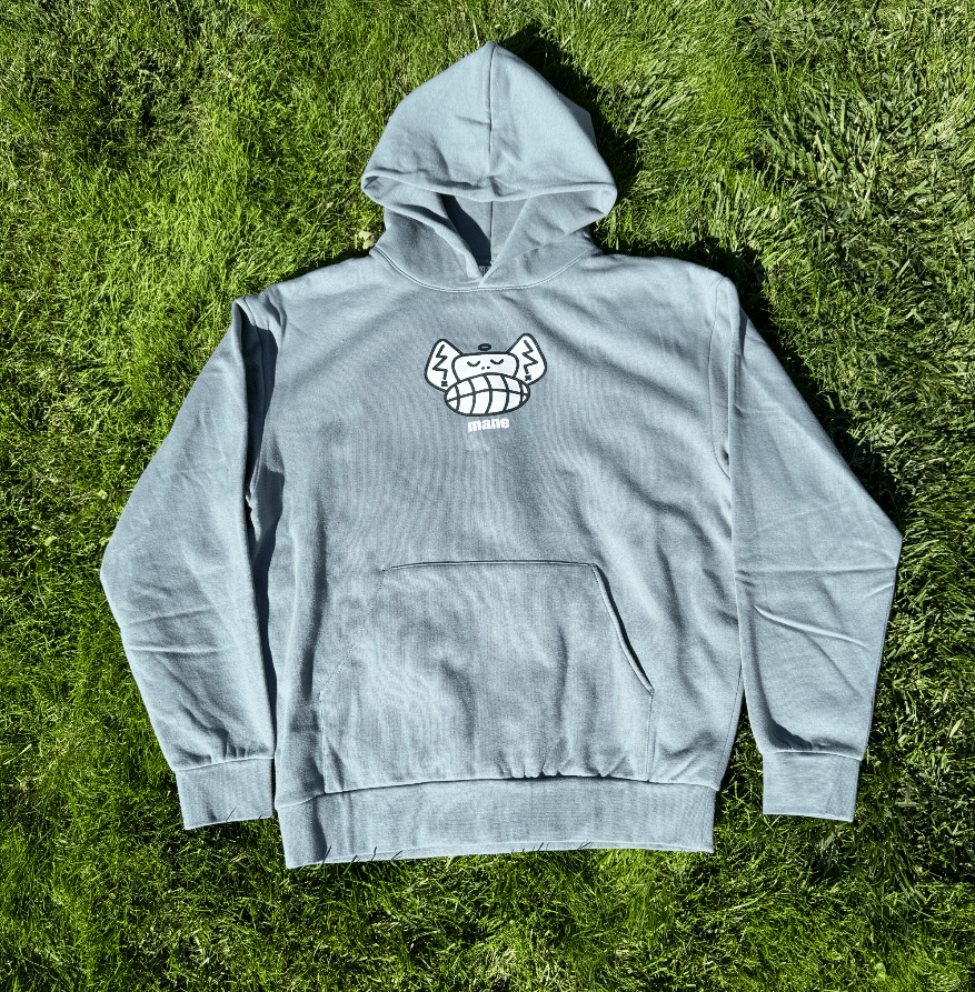 White and Black ink on midweight faded blue boxy hoodie. Please allow 2-3 weeks for production and shipping.