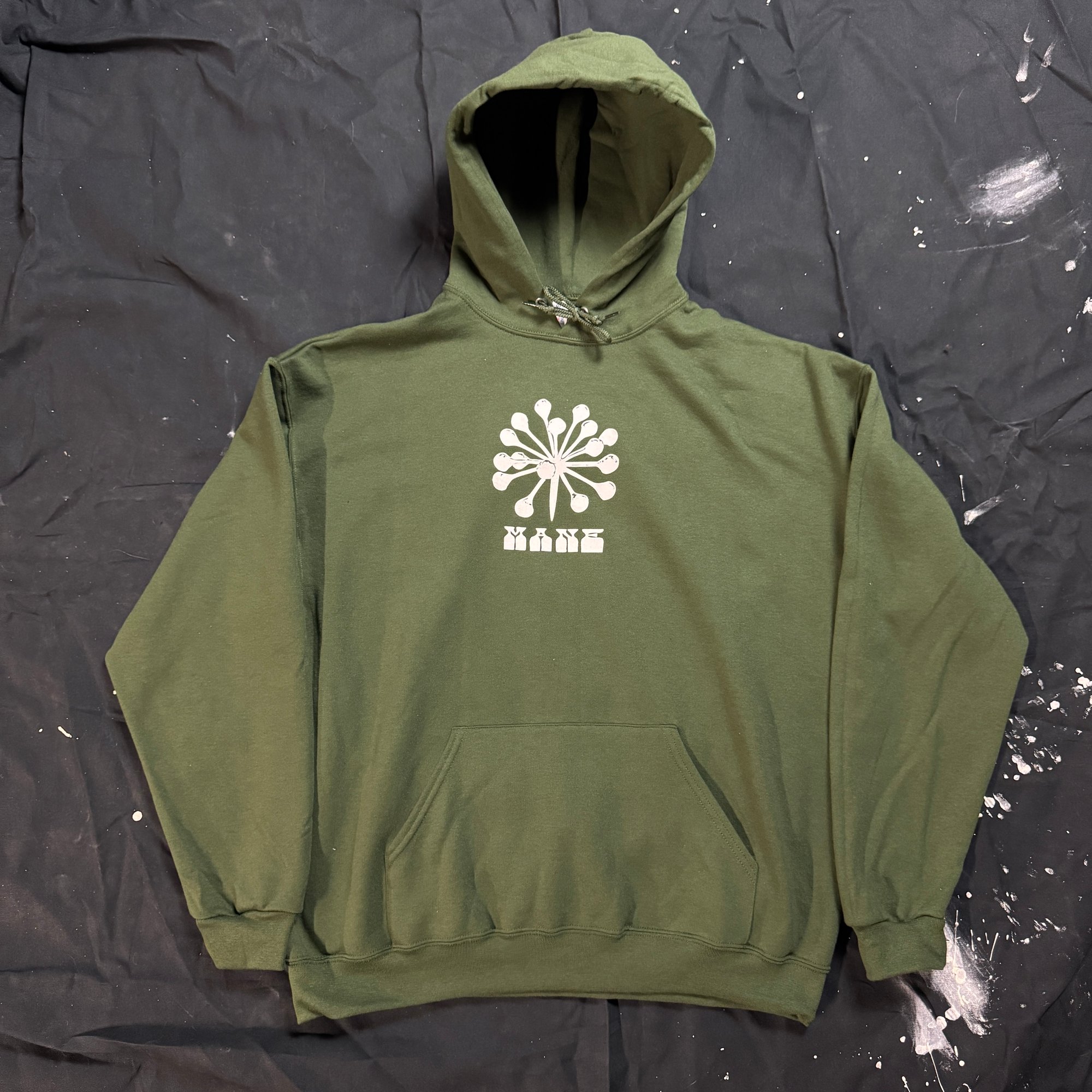 White ink on midweight green hoodie.