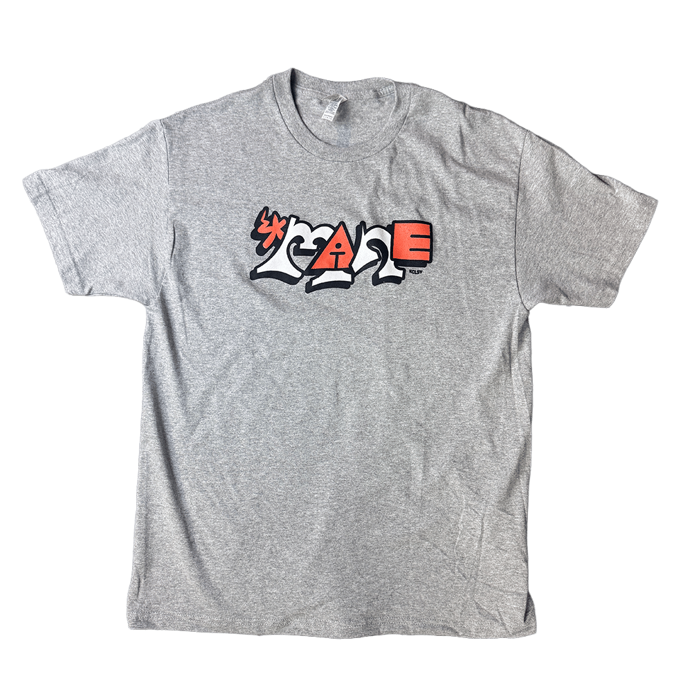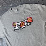 Orange, White, and Black ink on midweight Heather Grey cotton Tee.