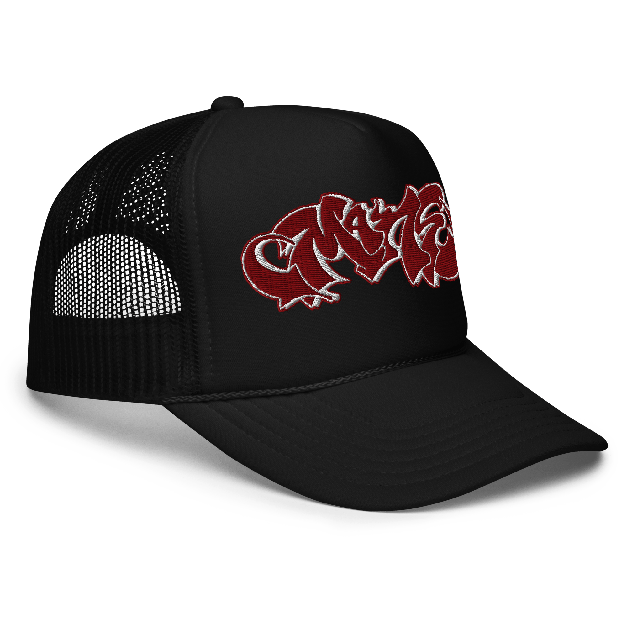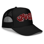 Letters by Graff.Paper. Two color Embroidery on black foam trucker.
