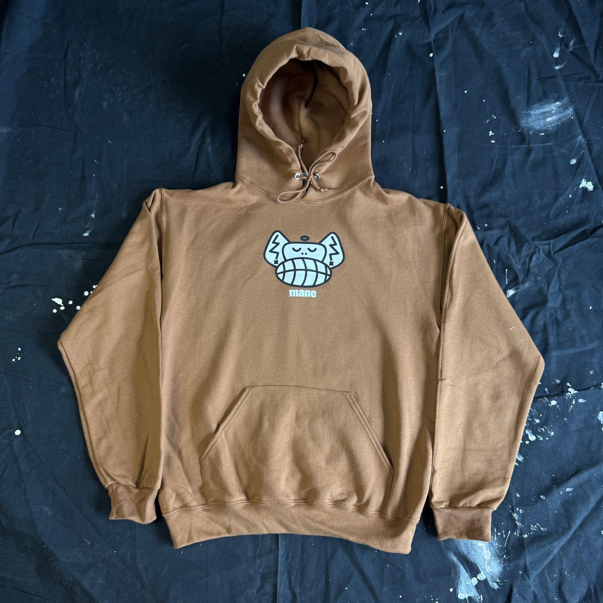 White and Black ink on midweight tan hoodie. Please allow 2-3 weeks for production and shipping.