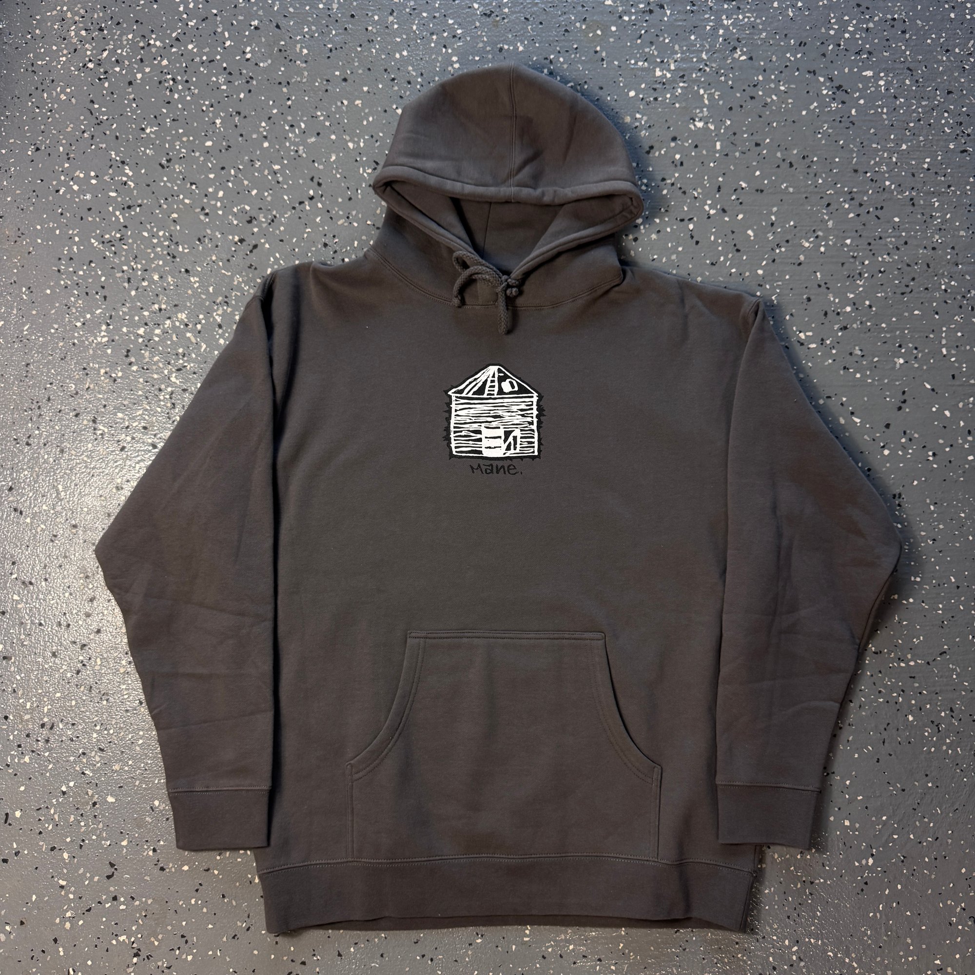 Black and White ink on 10 oz heavy-weight real charcoal gray hoodie.