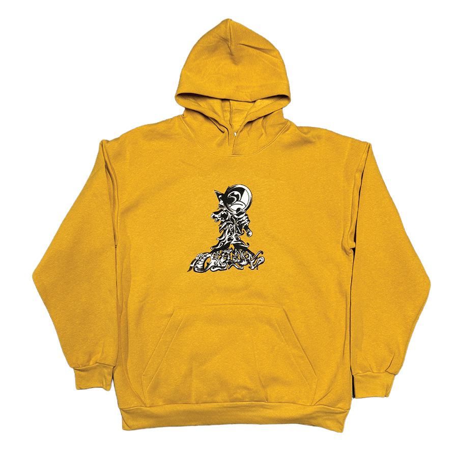 Black and white ink on mid-weight mustard hoodie. Collaboration with @squalorhouse