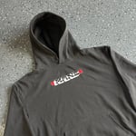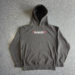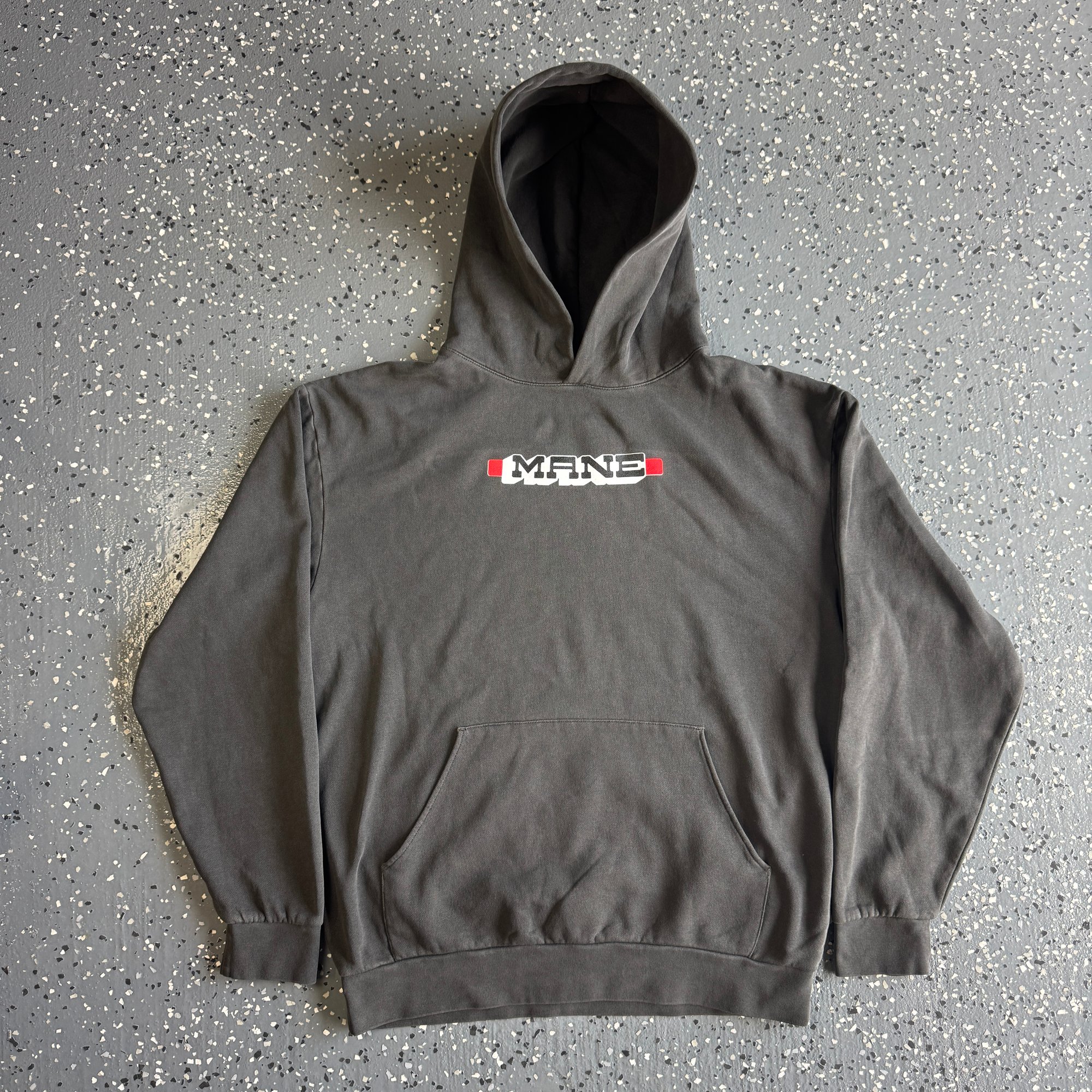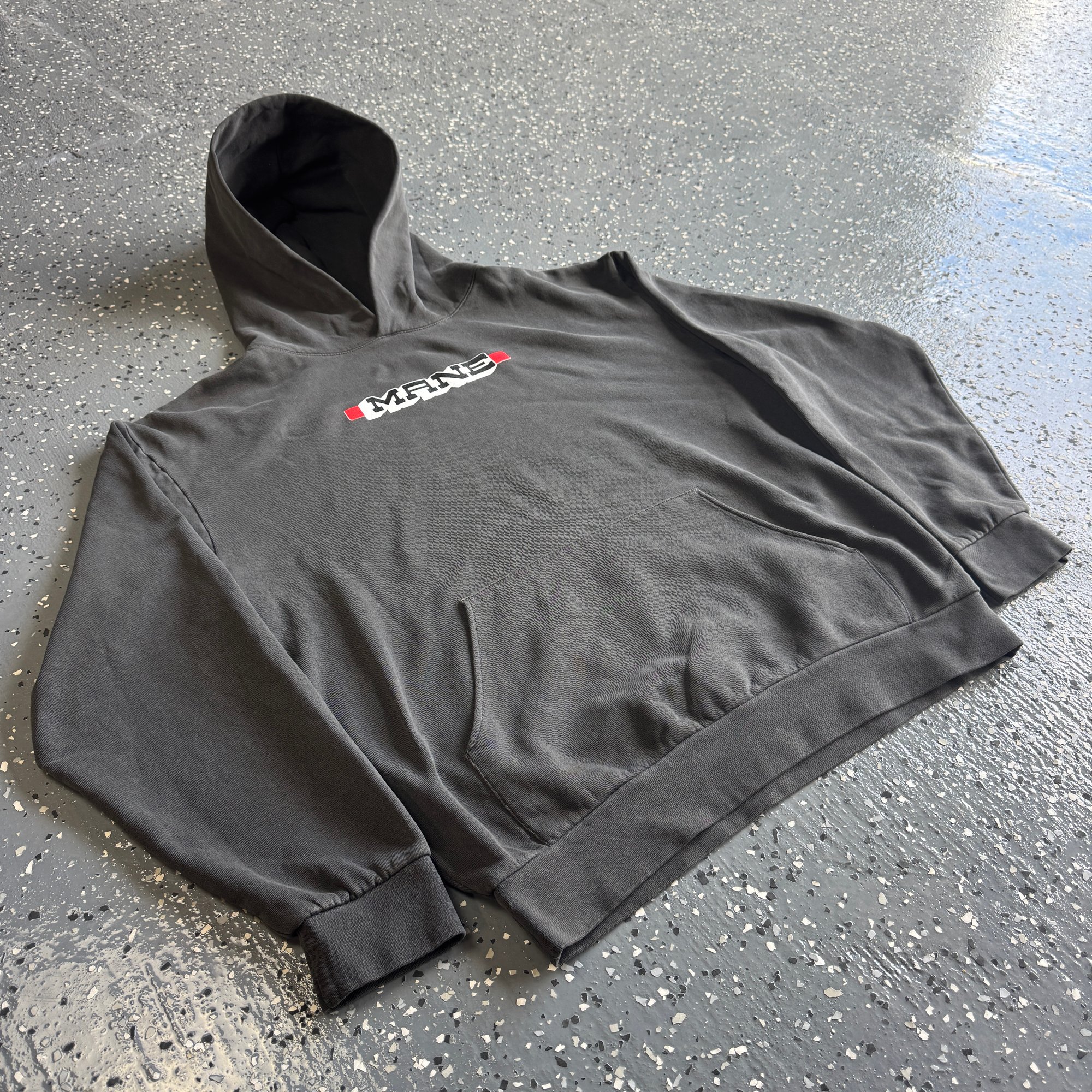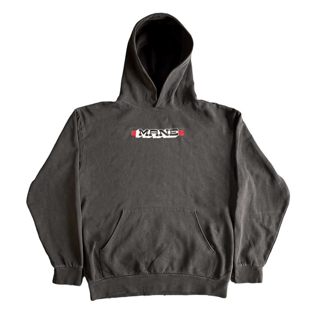 Black, White, & Red ink on charcoal garment dyed midweight cotton hoodie.